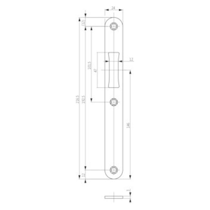 Met een lengte van 216 mm heeft de sluitplaat een ruim contactvlak, wat bijdraagt aan extra stabiliteit van de sluiting. De breedte van 24 mm maakt het model eenvoudig te monteren zonder dat de deur of het kozijn extra bewerkt hoeft te worden. De geringe dikte van 3 mm biedt daarbij een subtiele en nauwkeurige passing. Doordat de sluitplaat keerbaar is, kan ze zowel links- als rechtsdraaiend worden toegepast. Dat scheelt niet alleen tijd tijdens montage, maar biedt ook flexibiliteit voor uiteenlopende projectomgevingen.